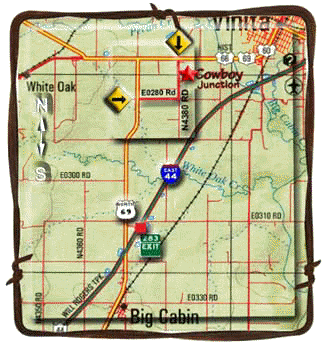Cowboy Junction's building is 2 miles west of Vinita, Oklahoma and ½ mile south on Road 4380. |
