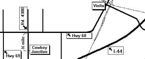 Cowboy Junction's building is 2 miles west of Vinita, Oklahoma and ½ mile south on Road 4380. |